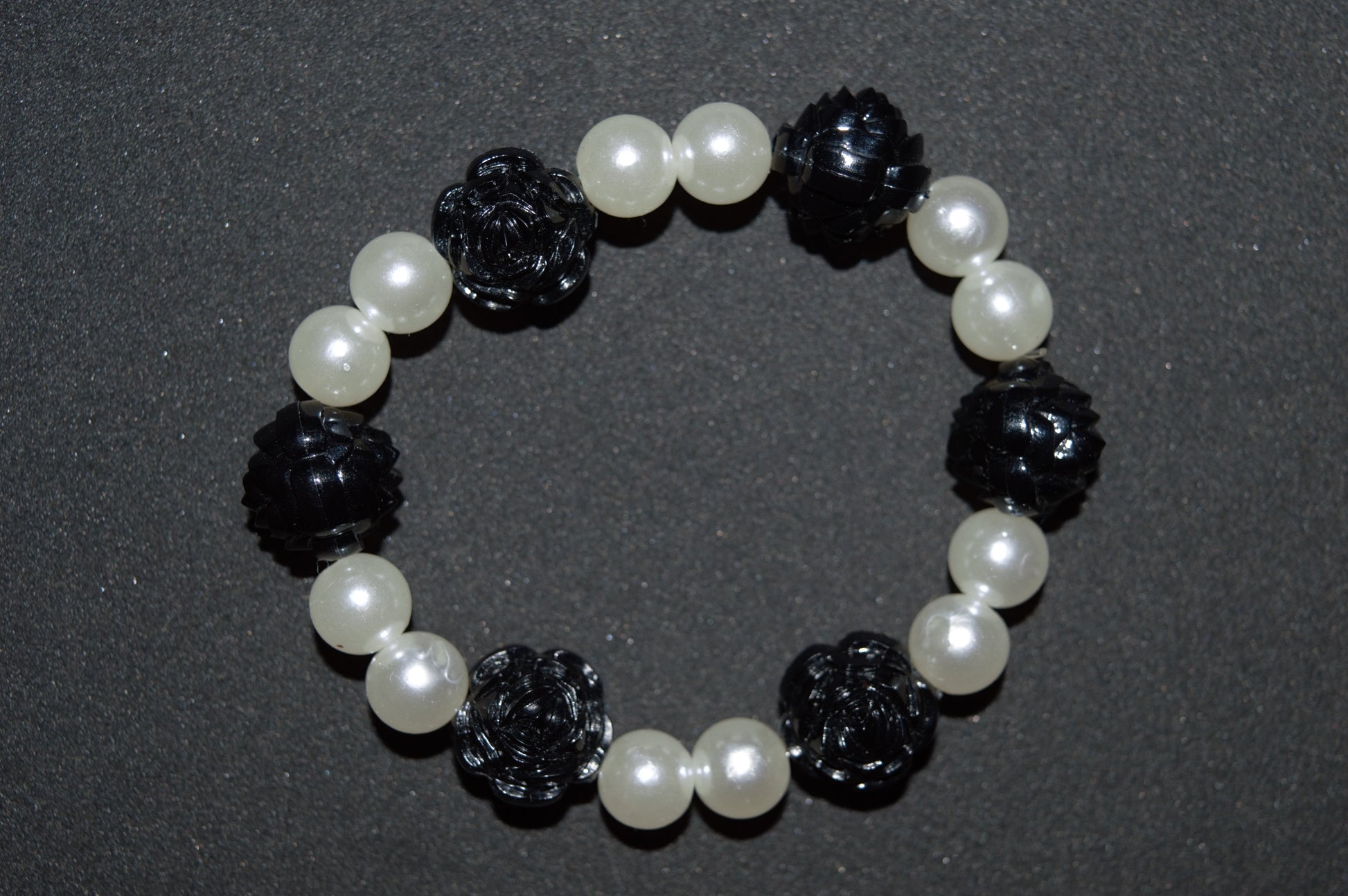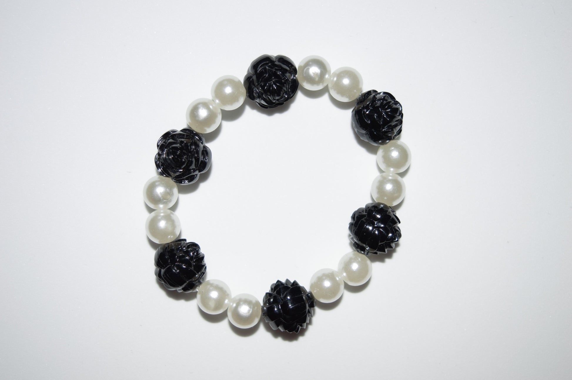 Handmade beautiful bracelet made from cream plastic pearls and black rose beads.