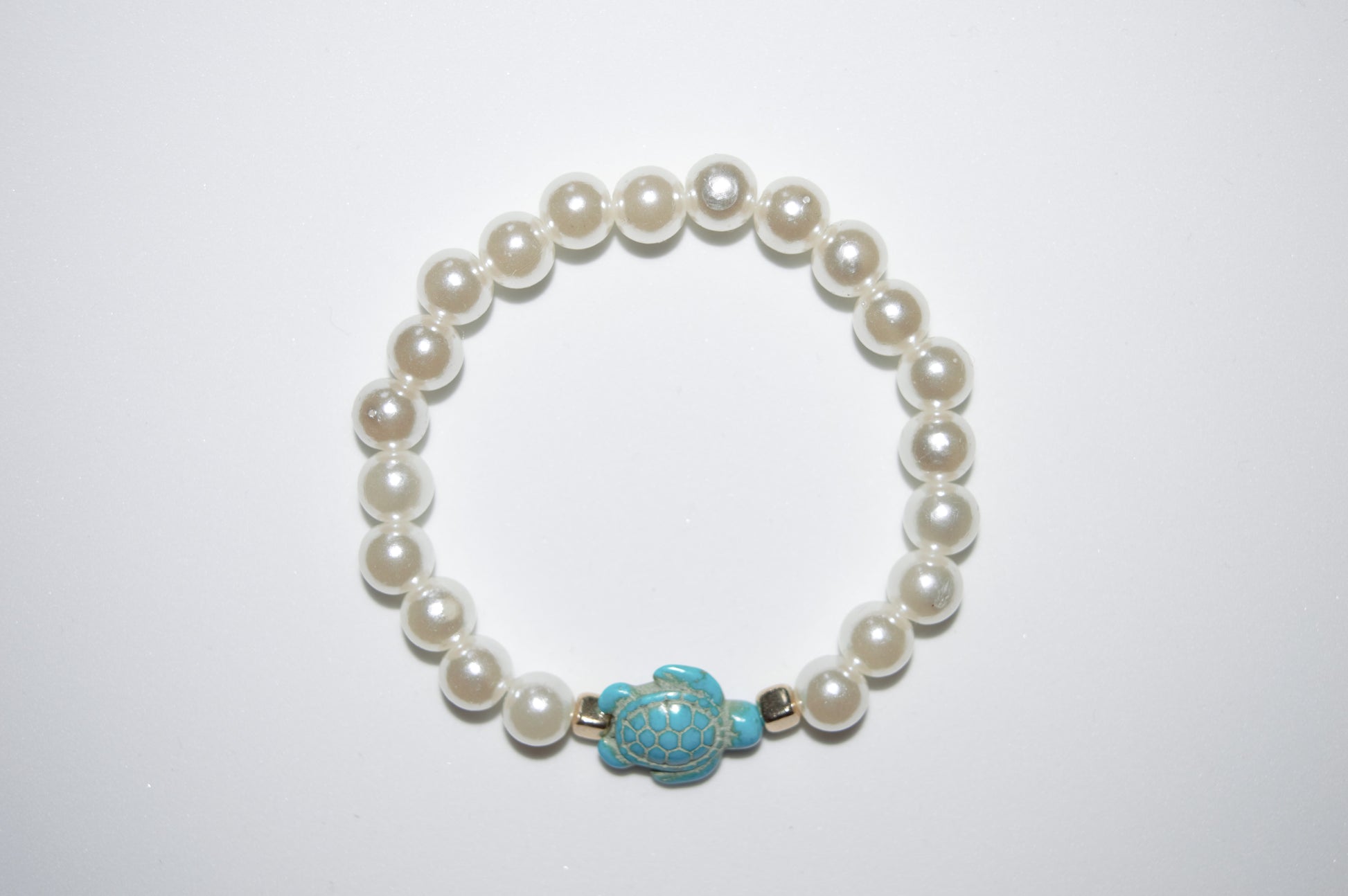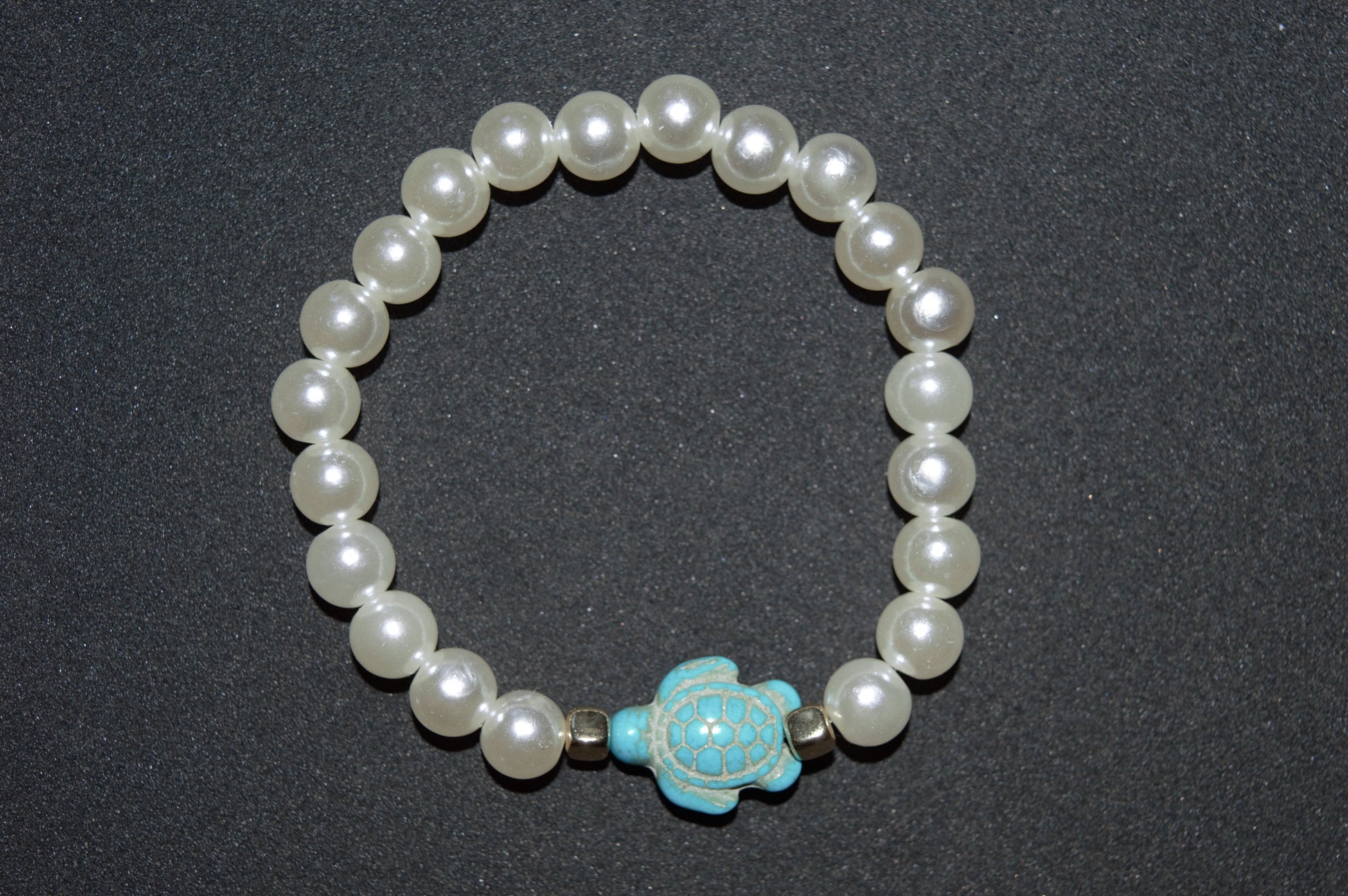Handmade bracelet made from cream plastic pearls and a blue turtle bead