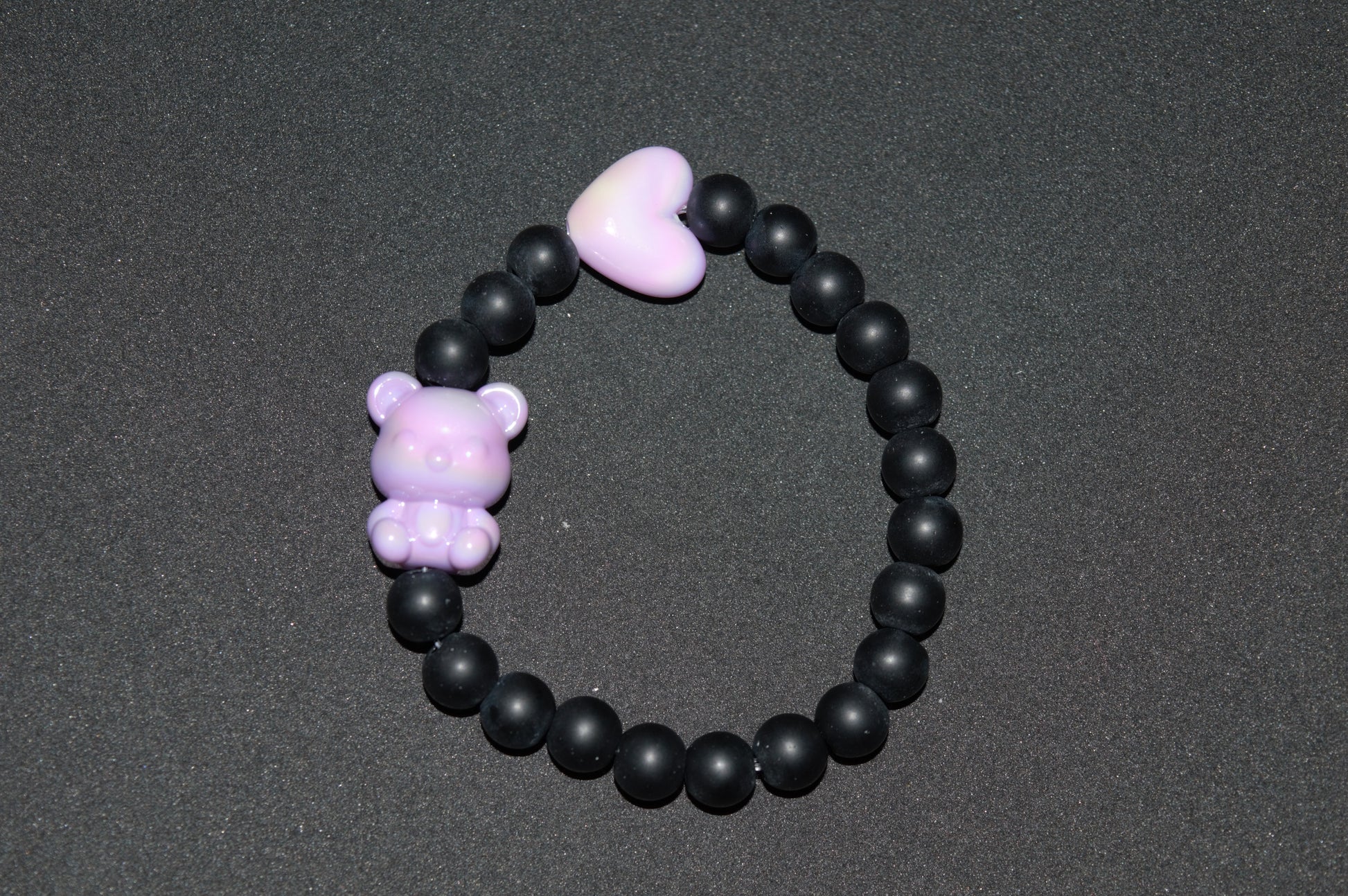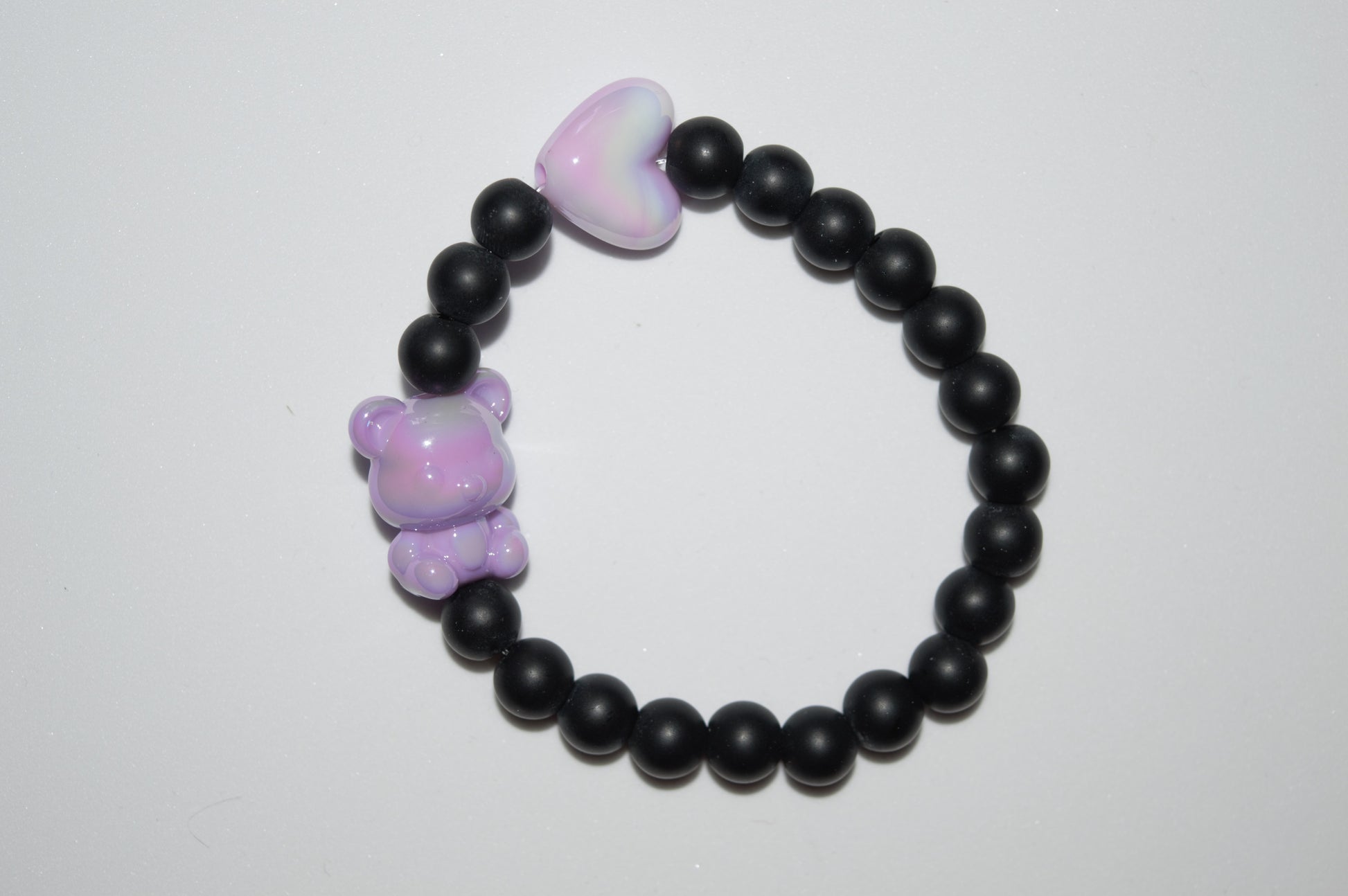 Handmade bracelet made from black stone beads and iridescent acrylic heart and teddy beads