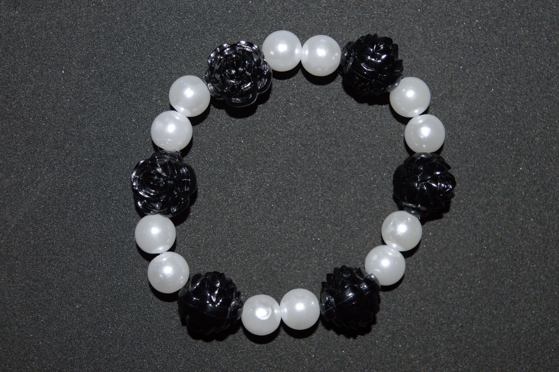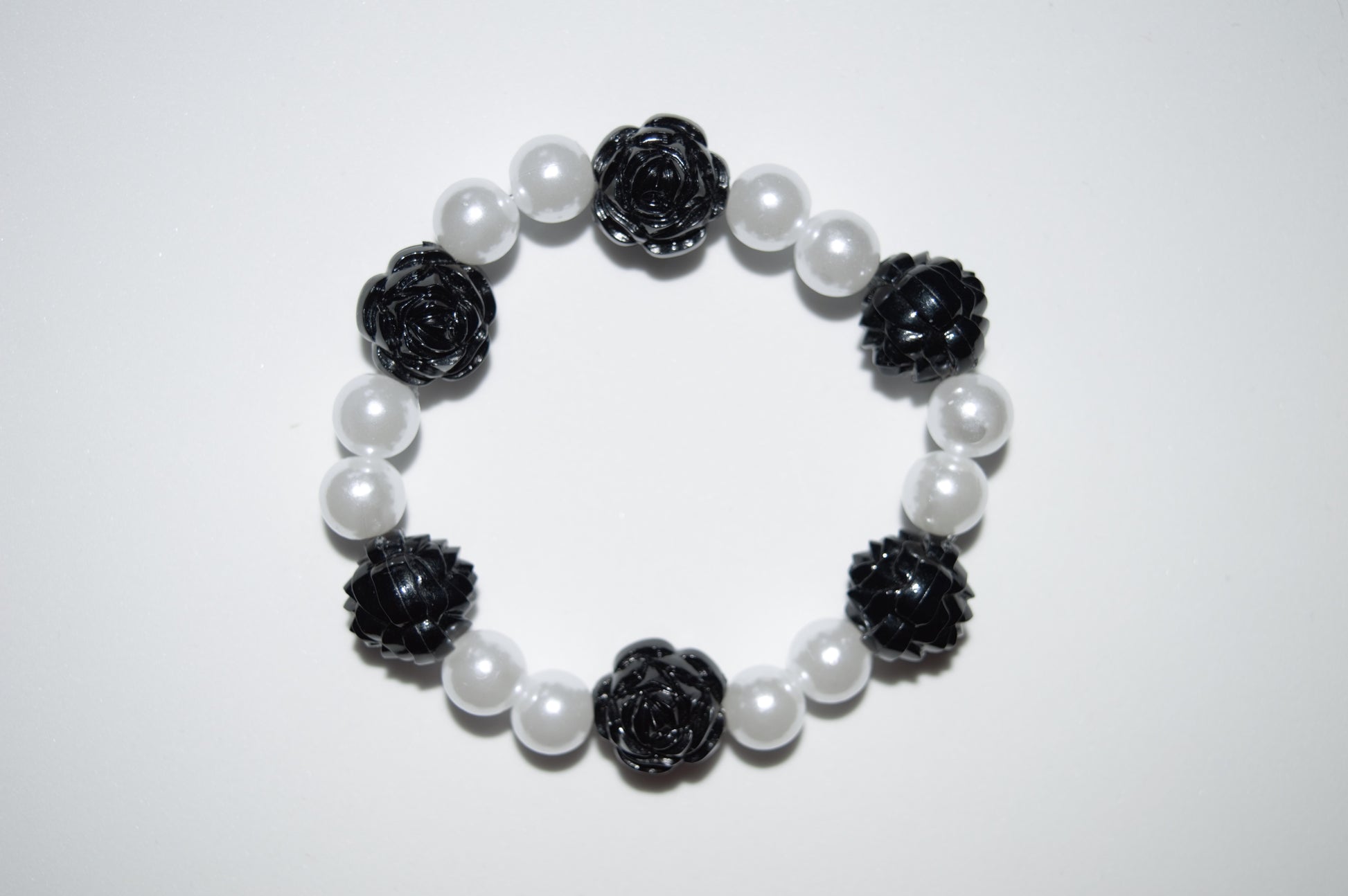 Handmade beautiful bracelet made from white plastic pearls and black rose beads.